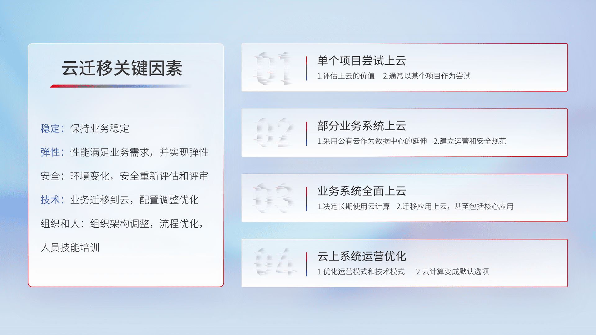 结合实际业务,,,,从规划设计、、、、云平台选型、、云原生改造、、、、数据迁移、、集成交付,,,,迁移全过程为客户识别最佳上云路径,,,做好风险识别管理,,,设计网络架构、、、身份权限、、、、安全审计合规、、、、操作审计、、、、日志审计、、、监控告警策略、、、、多站点容灾设计等,,对云上基础设施进行整体规划,,,提升IT治理水平,,,以满足弹性、、高可用、、高性能的需求。。