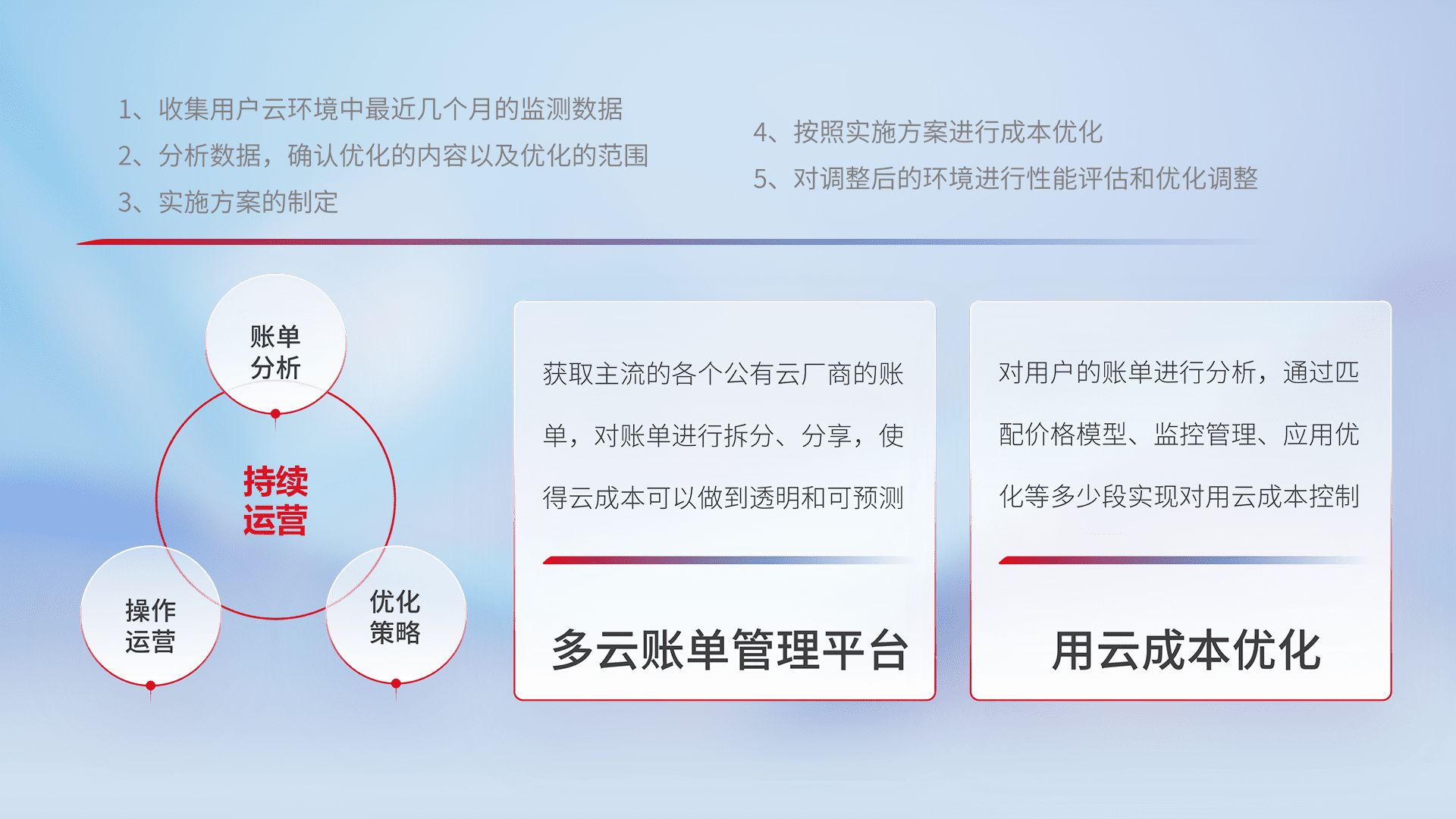 通过多云纳管,,以统一的资源数据模型把客户的云资源进行抽象和封装,,进而实现对多云资源的统一操作,,,保障云资源管理的可靠性、、稳定性与可用性。。。。量身定制化运维内容,,,,配置、、开发运维、、、补丁管理、、备份、、监控、、认证和访问管理、、、审计和日常巡检等,,保障在用云过程中的可靠度,,稳定度以及高可用率。。